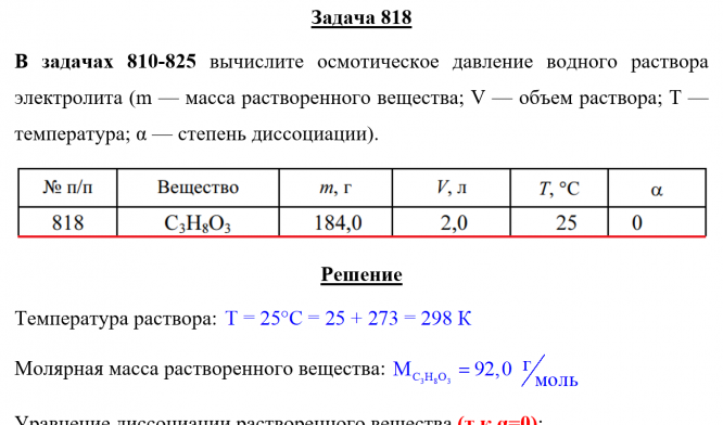 Задача 818 - вычислите осмотическое давление водного раствора электролита (m — масса растворенного вещества; V — объем раствора; Т — температура; α — степень диссоциации).
