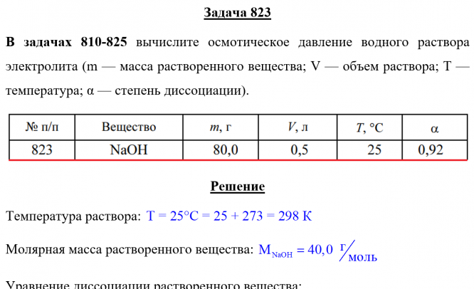Задача 823 - вычислите осмотическое давление водного раствора электролита (m — масса растворенного вещества; V — объем раствора; Т — температура; α — степень диссоциации).