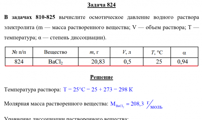 Задача 824 - вычислите осмотическое давление водного раствора электролита (m — масса растворенного вещества; V — объем раствора; Т — температура; α — степень диссоциации).