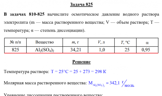 Задача 825 - вычислите осмотическое давление водного раствора электролита (m — масса растворенного вещества; V — объем раствора; Т — температура; α — степень диссоциации).