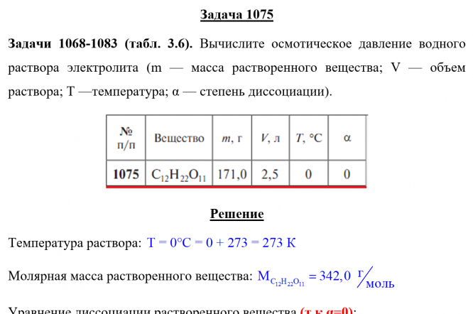 Задача 1075 - Вычислите осмотическое давление водного раствора электролита (m — масса растворенного вещества; V — объем раствора; Т —температура; α — степень диссоциации).
