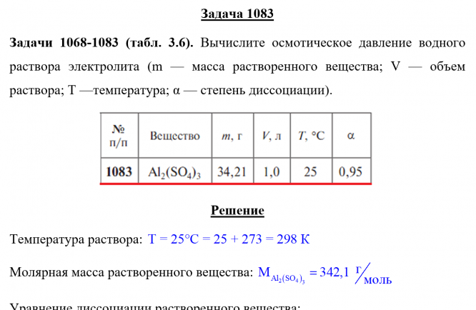Задача 1083 - Вычислите осмотическое давление водного раствора электролита (m — масса растворенного вещества; V — объем раствора; Т —температура; α — степень диссоциации).