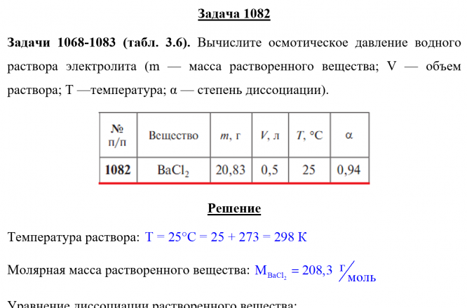 Задача 1082 - Вычислите осмотическое давление водного раствора электролита (m — масса растворенного вещества; V — объем раствора; Т —температура; α — степень диссоциации).