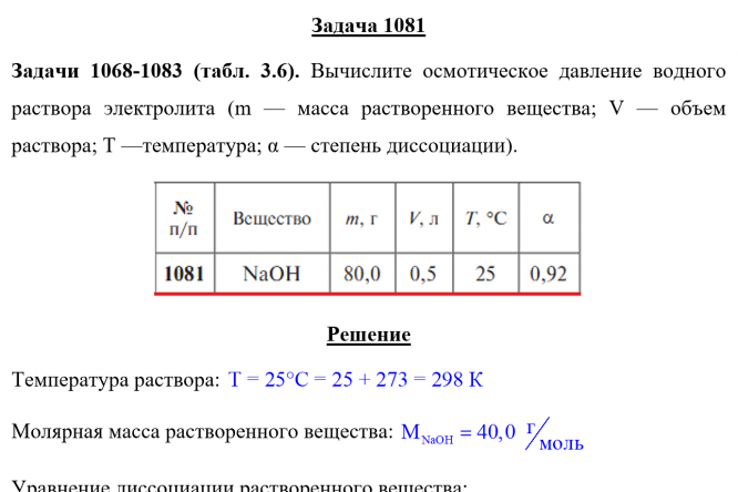Главная » Учебные материалы » Химия » Решения задач » Несколько классов/семестров » Номер 1081 » Задача 1081 - Вычислите осмотическое давление водного раствора электролита (m — масса растворенного вещества; V — объем раствора; Т —температура; α — степень диссоциации).