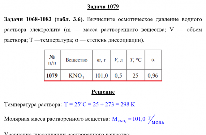 Главная » Учебные материалы » Химия » Решения задач » Несколько классов/семестров » Номер 1079 » Задача 1079 - Вычислите осмотическое давление водного раствора электролита (m — масса растворенного вещества; V — объем раствора; Т —температура; α — степень диссоциации).