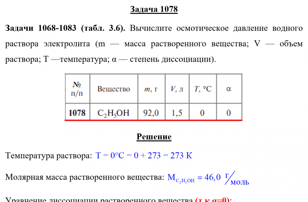 Задача 1078 - Вычислите осмотическое давление водного раствора электролита (m — масса растворенного вещества; V — объем раствора; Т —температура; α — степень диссоциации).
