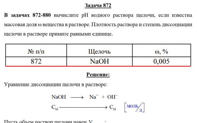 Задача 872 - вычислите pH водного раствора щелочи, если известна массовая доля ω вещества в растворе. Плотность раствора и степень диссоциации щелочи в растворе примите равными единице.