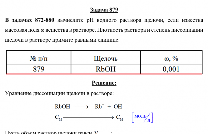 Задача 879 - вычислите pH водного раствора щелочи, если известна массовая доля ω вещества в растворе. Плотность раствора и степень диссоциации щелочи в растворе примите равными единице.