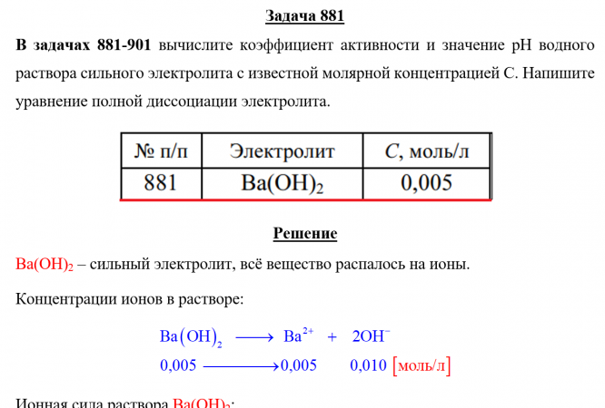 Задача 881 - вычислите коэффициент активности и значение pH водного раствора сильного электролита с известной молярной концентрацией С. Напишите уравнение полной диссоциации электролита.