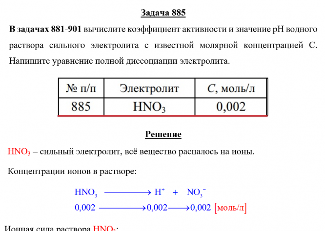 Главная » Учебные материалы » Химия » Решения задач » Несколько классов/семестров » Номер 885 » Задача 885 - вычислите коэффициент активности и значение pH водного раствора сильного электролита с известной молярной концентрацией С. Напишите уравнение полной диссоциации электролита.