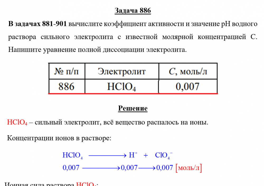 Для студентов по предмету ХимияЗадача 886 - вычислите коэффициент активности и значение pH водного раствора сильного электролита с известной молярной концентрацией С. Напишите уравнЗадача 886 - вычислите коэффициент активности и значение pH водного раствора сильного электролита с известной молярной концентрацией С. Напишите уравн