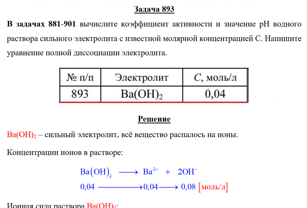 Для студентов по предмету ХимияЗадача 893 - вычислите коэффициент активности и значение pH водного раствора сильного электролита с известной молярной концентрацией С. Напишите уравнЗадача 893 - вычислите коэффициент активности и значение pH водного раствора сильного электролита с известной молярной концентрацией С. Напишите уравн