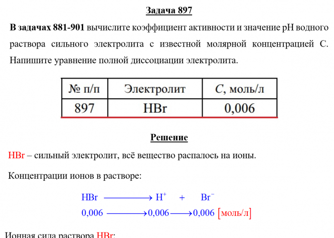 Главная » Учебные материалы » Химия » Решения задач » Несколько классов/семестров » Номер 897 » Задача 897 - вычислите коэффициент активности и значение pH водного раствора сильного электролита с известной молярной концентрацией С. Напишите уравнение полной диссоциации электролита.