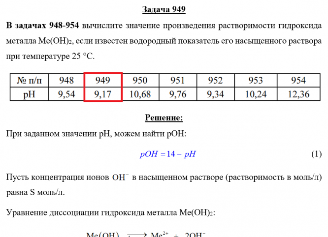 Задача 949 - вычислите значение произведения растворимости гидроксида металла Me(OH)2, если известен водородный показатель его насыщенного раствора при температуре 25 °С.