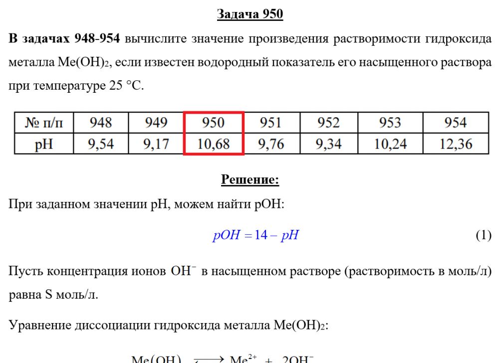 Задача 950 - вычислите значение произведения растворимости гидроксида металла Me(OH)2, если известен водородный показатель его насыщенного раствора при температуре 25 °С.