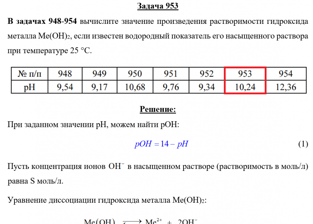 Задача 953 - вычислите значение произведения растворимости гидроксида металла Me(OH)2, если известен водородный показатель его насыщенного раствора при температуре 25 °С.