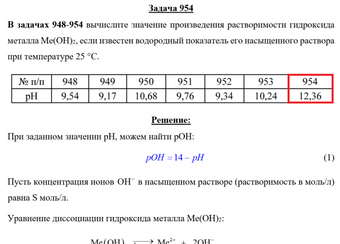 Задача 954 - вычислите значение произведения растворимости гидроксида металла Me(OH)2, если известен водородный показатель его насыщенного раствора при температуре 25 °С.