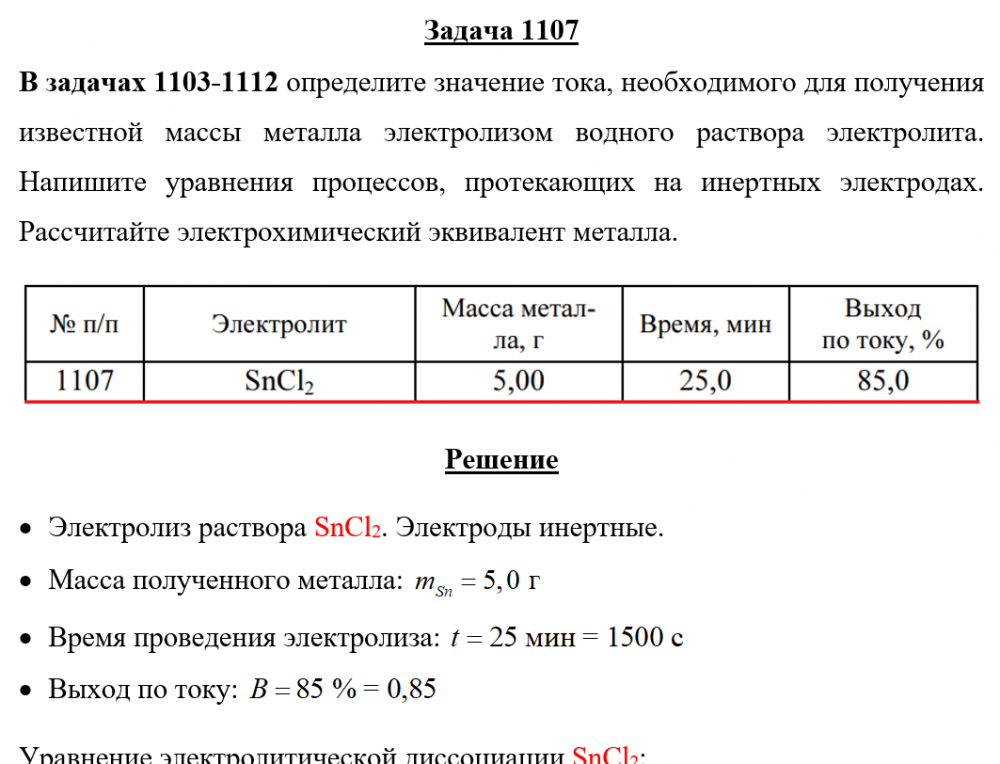 Задача 1107 - определите значение тока, необходимого для получения известной массы металла электролизом водного раствора электролита. Напишите уравнения процессов, протекающих на инертных электродах. Рассчитайте электрохимический эквивалент металла.