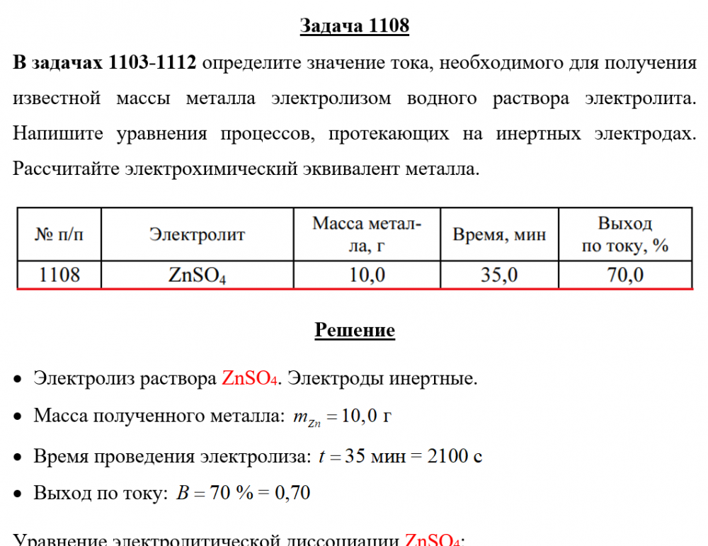 Задача 1108 - определите значение тока, необходимого для получения известной массы металла электролизом водного раствора электролита. Напишите уравнения процессов, протекающих на инертных электродах. Рассчитайте электрохимический эквивалент металла.