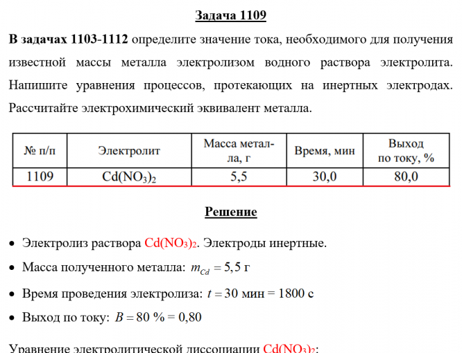 Задача 1109 - определите значение тока, необходимого для получения известной массы металла электролизом водного раствора электролита. Напишите уравнения процессов, протекающих на инертных электродах. Рассчитайте электрохимический эквивалент металла.