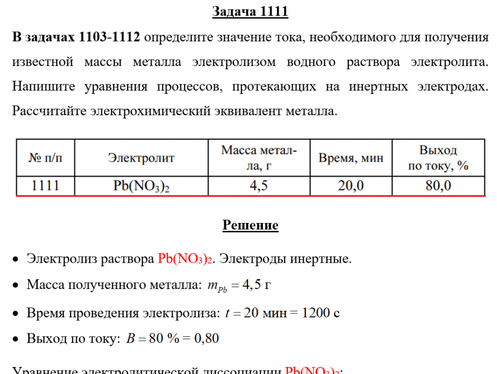 Задача 1111 - определите значение тока, необходимого для получения известной массы металла электролизом водного раствора электролита. Напишите уравнения процессов, протекающих на инертных электродах. Рассчитайте электрохимический эквивалент металла.