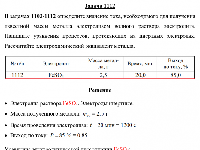 Задача 1112 - определите значение тока, необходимого для получения известной массы металла электролизом водного раствора электролита. Напишите уравнения процессов, протекающих на инертных электродах. Рассчитайте электрохимический эквивалент металла.