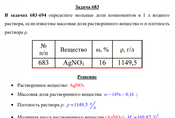 Задача 683 - определите мольные доли компонентов в 1 л водного раствора, если известны массовая доля растворенного вещества ω и плотность раствора ρ.