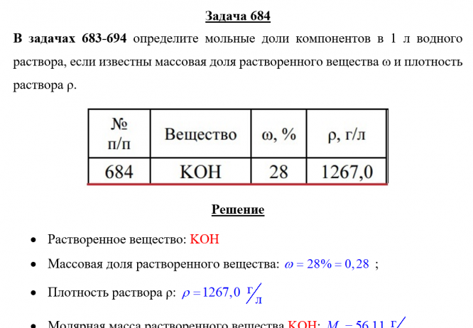 Задача 684 - определите мольные доли компонентов в 1 л водного раствора, если известны массовая доля растворенного вещества ω и плотность раствора ρ.