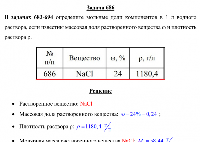 Задача 686 - определите мольные доли компонентов в 1 л водного раствора, если известны массовая доля растворенного вещества ω и плотность раствора ρ.