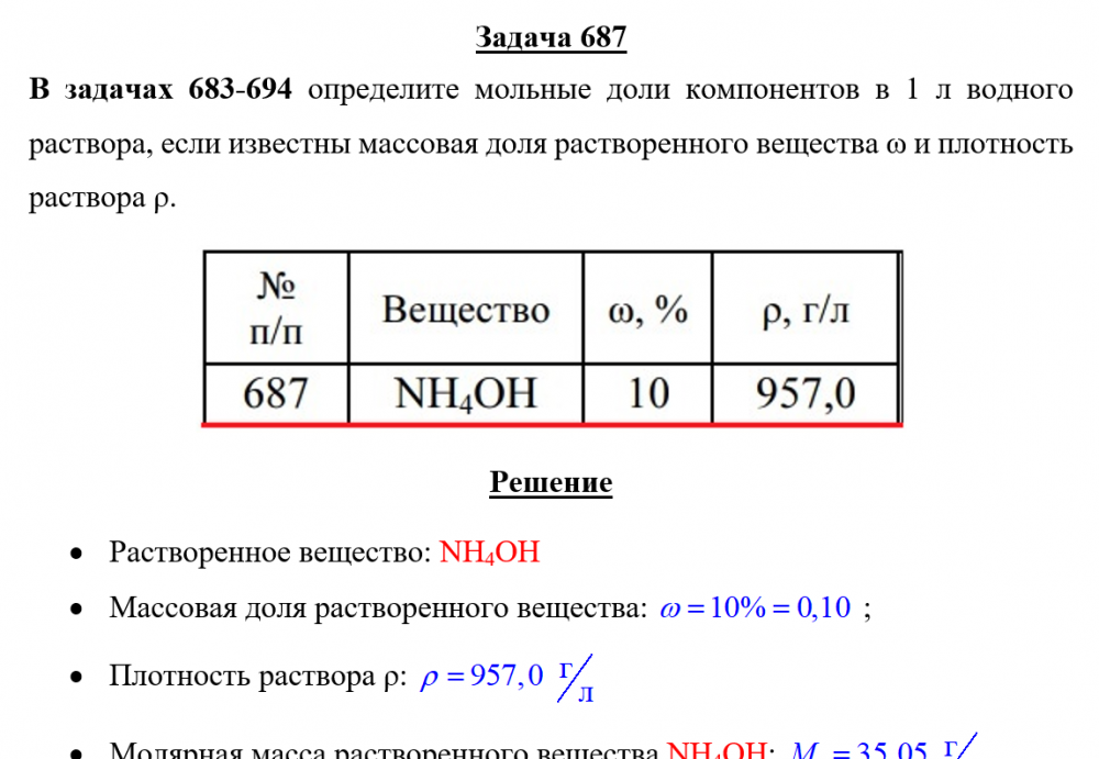 Задача 687 - определите мольные доли компонентов в 1 л водного раствора, если известны массовая доля растворенного вещества ω и плотность раствора ρ.