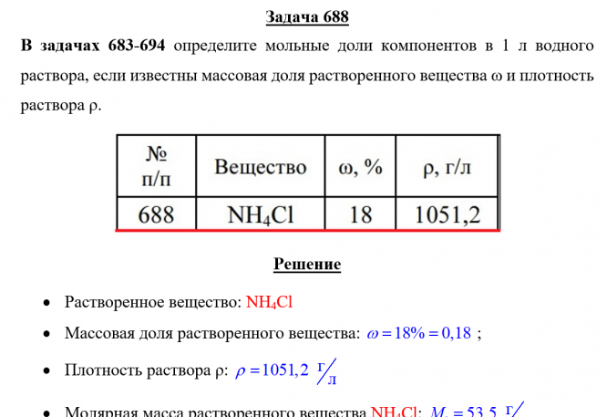Задача 688 - определите мольные доли компонентов в 1 л водного раствора, если известны массовая доля растворенного вещества ω и плотность раствора ρ.