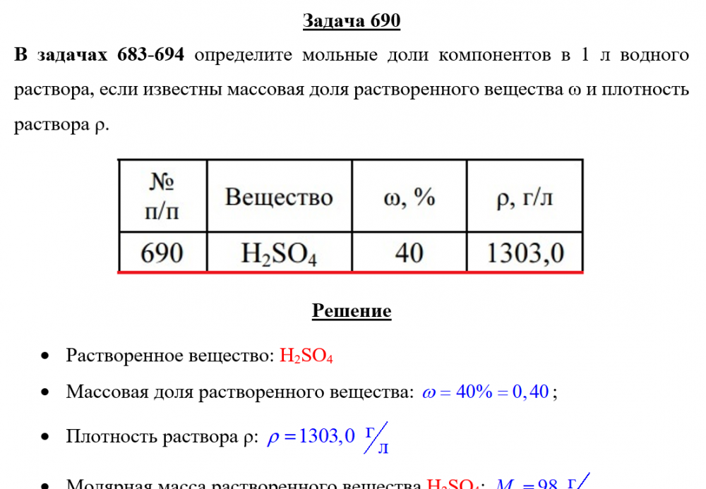 Задача 690 - определите мольные доли компонентов в 1 л водного раствора, если известны массовая доля растворенного вещества ω и плотность раствора ρ.