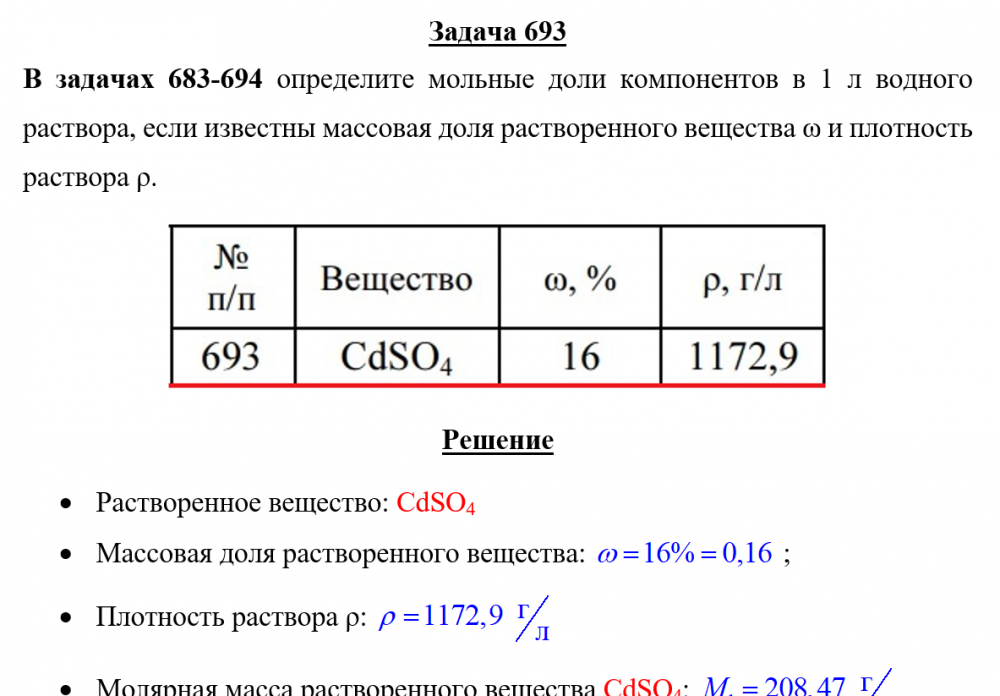 Задача 693 - определите мольные доли компонентов в 1 л водного раствора, если известны массовая доля растворенного вещества ω и плотность раствора ρ.