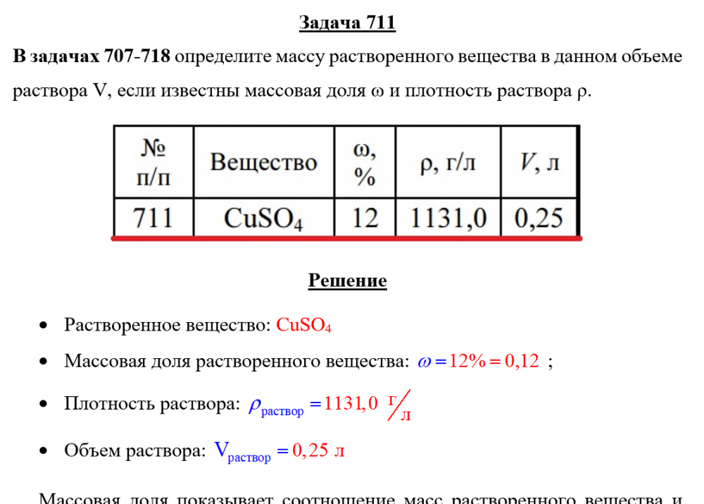 Задача 711 - определите массу растворенного вещества в данном объеме раствора V, если известны массовая доля ω и плотность раствора ρ.