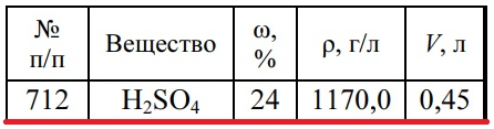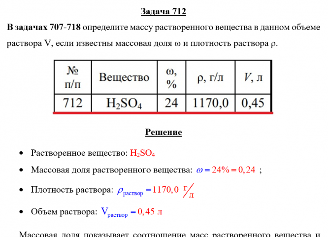 Задача 712 - определите массу растворенного вещества в данном объеме раствора V, если известны массовая доля ω и плотность раствора ρ.