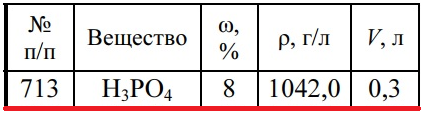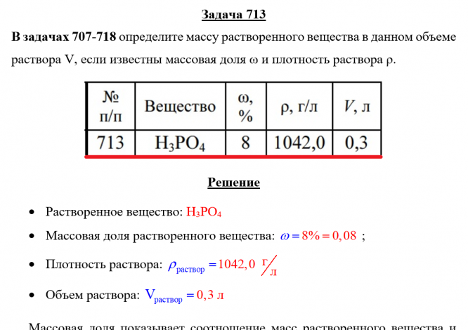 Задача 713 - определите массу растворенного вещества в данном объеме раствора V, если известны массовая доля ω и плотность раствора ρ.
