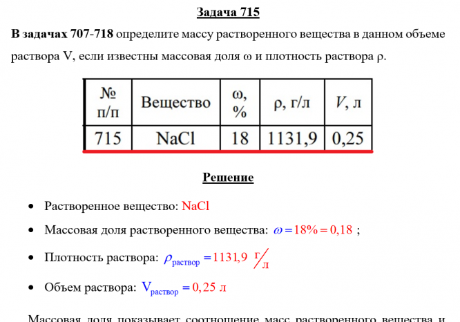 Задача 715 - определите массу растворенного вещества в данном объеме раствора V, если известны массовая доля ω и плотность раствора ρ.