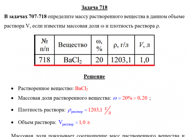 Задача 718 - определите массу растворенного вещества в данном объеме раствора V, если известны массовая доля ω и плотность раствора ρ.