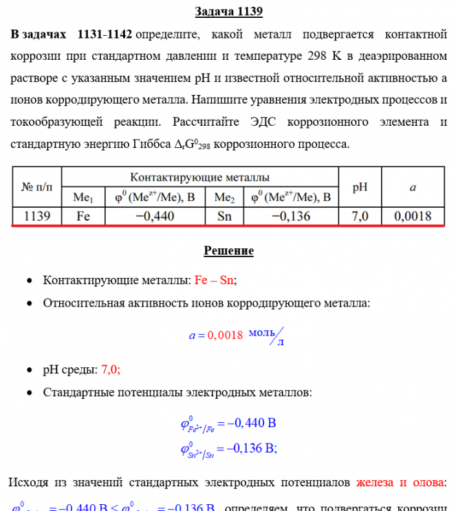 Задача 1139 - определите, какой металл подвергается контактной коррозии при стандартном давлении и температуре 298 K в деаэрированном растворе с указанным значением рН и известной относительной активностью a ионов корродирующего металла. Напишите ура