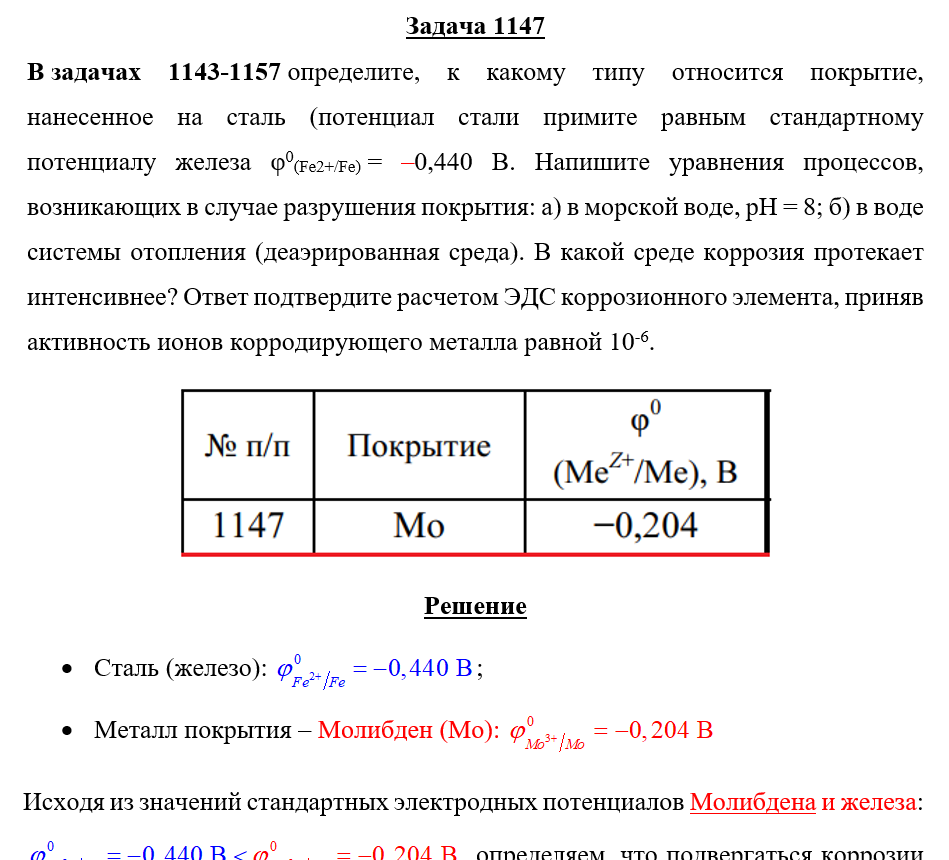Задача 1147 - определите, к какому типу относится покрытие, нанесенное на сталь (потенциал стали примите равным стандартному потенциалу железа φ0(Fe2+/Fe) = -0,440 В. Напишите уравнения процессов, возникающих в случае разрушения покрытия: а) в морско
