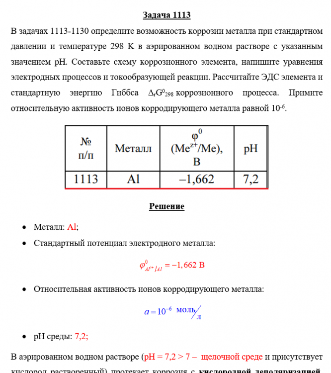 Для студентов по предмету ХимияЗадача 1113 - определите возможность коррозии металла при стандартном давлении и температуре 298 K в аэрированном водном растворе с указанным значениеЗадача 1113 - определите возможность коррозии металла при стандартном давлении и температуре 298 K в аэрированном водном растворе с указанным значение