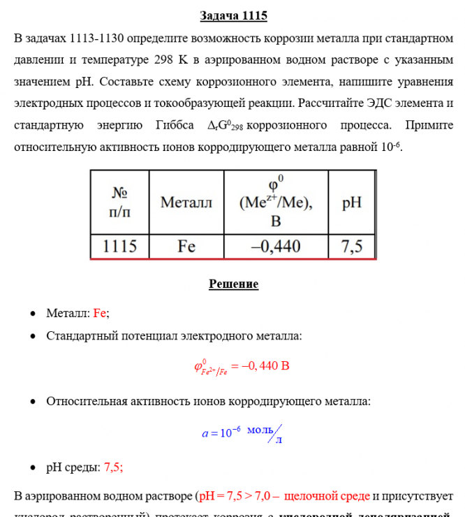 Для студентов по предмету ХимияЗадача 1115 - определите возможность коррозии металла при стандартном давлении и температуре 298 K в аэрированном водном растворе с указанным значениеЗадача 1115 - определите возможность коррозии металла при стандартном давлении и температуре 298 K в аэрированном водном растворе с указанным значение
