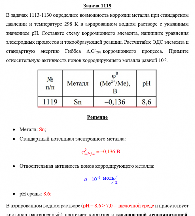 Для студентов по предмету ХимияЗадача 1119 - определите возможность коррозии металла при стандартном давлении и температуре 298 K в аэрированном водном растворе с указанным значениеЗадача 1119 - определите возможность коррозии металла при стандартном давлении и температуре 298 K в аэрированном водном растворе с указанным значение