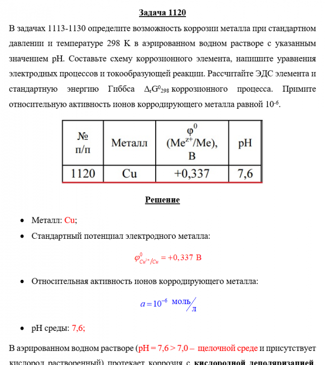 Для студентов по предмету ХимияЗадача 1120 - определите возможность коррозии металла при стандартном давлении и температуре 298 K в аэрированном водном растворе с указанным значениеЗадача 1120 - определите возможность коррозии металла при стандартном давлении и температуре 298 K в аэрированном водном растворе с указанным значение