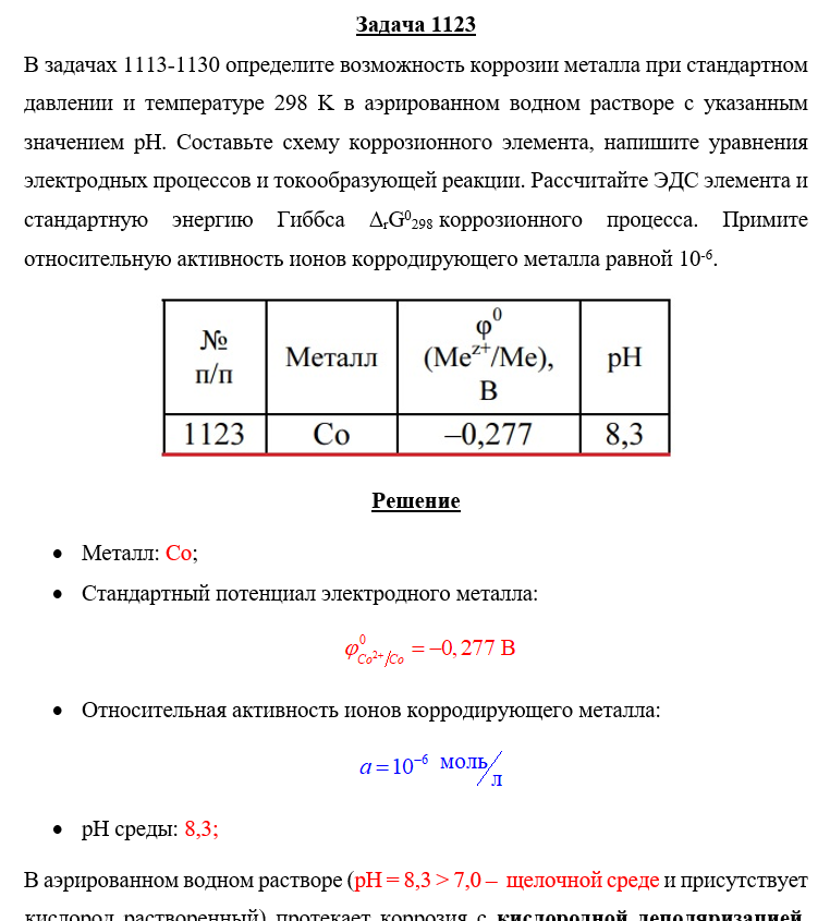 Для студентов по предмету ХимияЗадача 1123 - определите возможность коррозии металла при стандартном давлении и температуре 298 K в аэрированном водном растворе с указанным значениеЗадача 1123 - определите возможность коррозии металла при стандартном давлении и температуре 298 K в аэрированном водном растворе с указанным значение