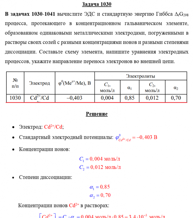 Главная » Учебные материалы » Химия » Решения задач » Несколько классов/семестров » Номер 1030 » Задача 1030 - вычислите ЭДС и стандартную энергию Гиббса ΔrG0298 процесса, протекающего в концентрационном гальваническом элементе, образованном одинаковыми металлическими электродами, погруженными в растворы своих солей с разными концентрациями ионо