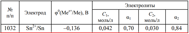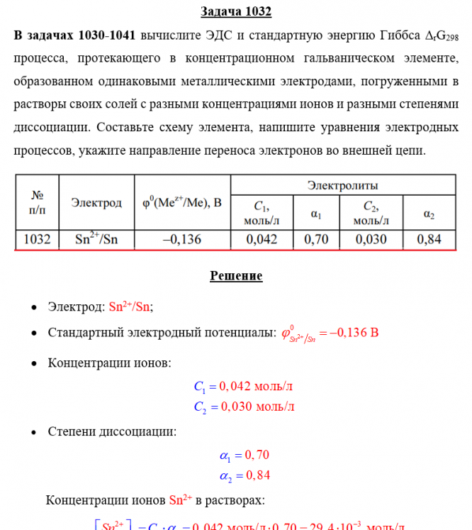 Главная » Учебные материалы » Химия » Решения задач » Несколько классов/семестров » Номер 1032 » Задача 1032 - вычислите ЭДС и стандартную энергию Гиббса ΔrG0298 процесса, протекающего в концентрационном гальваническом элементе, образованном одинаковыми металлическими электродами, погруженными в растворы своих солей с разными концентрациями ионо