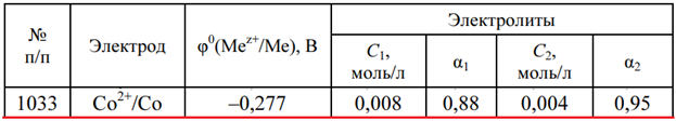 Задача 1033 - вычислите ЭДС и стандартную энергию Гиббса ΔrG0298 процесса, протекающего в концентрационном гальваническом элементе, образованном одинаковыми металлическими электродами, погруженными в растворы своих солей с разными концентрациями ионо