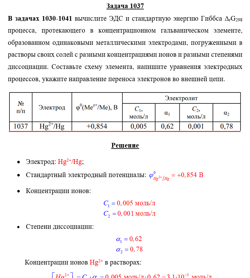 Задача 1037 - вычислите ЭДС и стандартную энергию Гиббса ΔrG0298 процесса, протекающего в концентрационном гальваническом элементе, образованном одинаковыми металлическими электродами, погруженными в растворы своих солей с разными концентрациями ионо