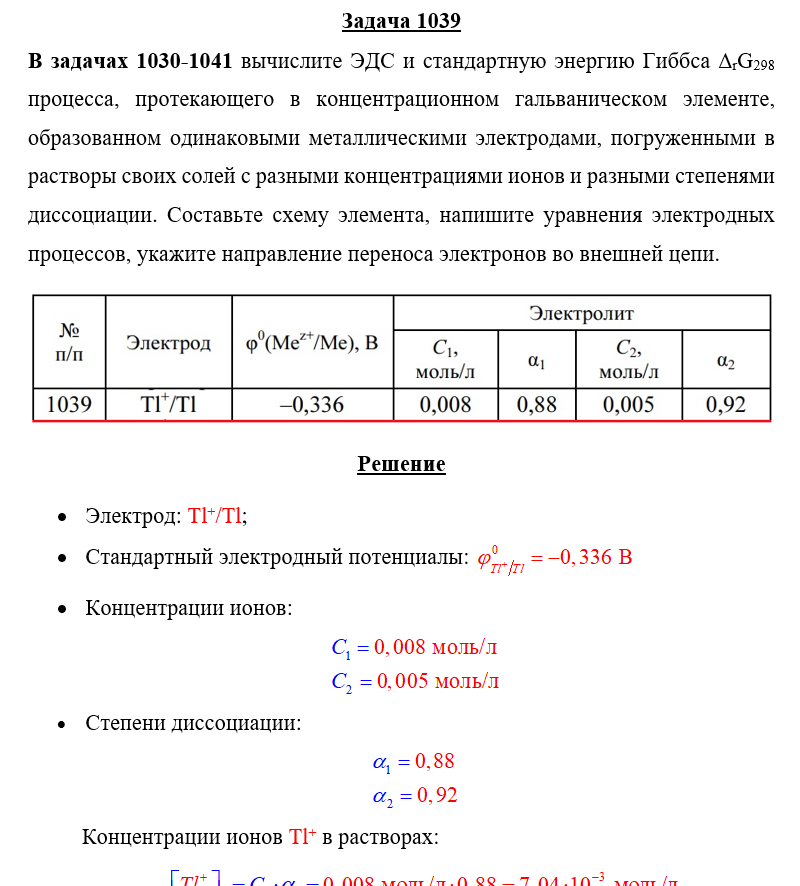 Задача 1039 - вычислите ЭДС и стандартную энергию Гиббса ΔrG0298 процесса, протекающего в концентрационном гальваническом элементе, образованном одинаковыми металлическими электродами, погруженными в растворы своих солей с разными концентрациями ионо